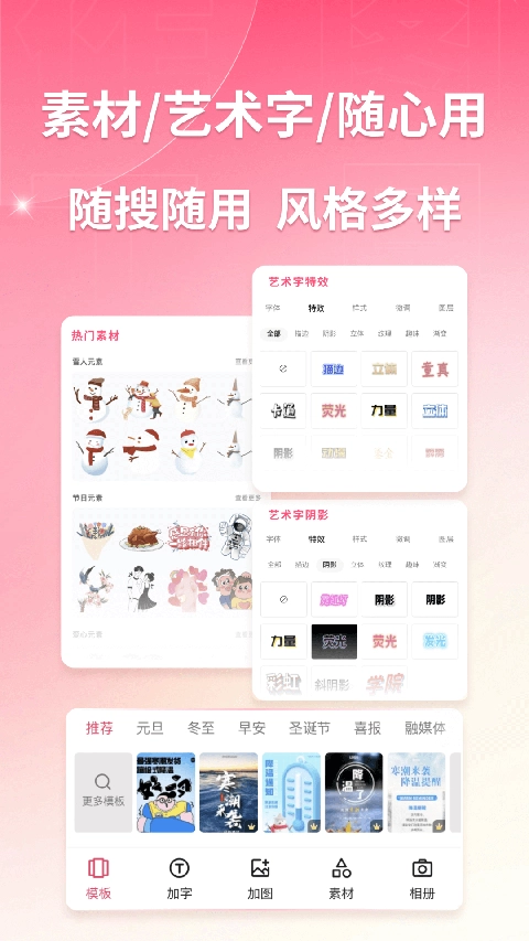 这款软件了海量丰富的素材资源库,涵盖文字、图形、图片等多元创作元素,用户能够根据自身需求自由挑选并灵活组合搭配,轻松打造出独具个人风格的专属海报作品。