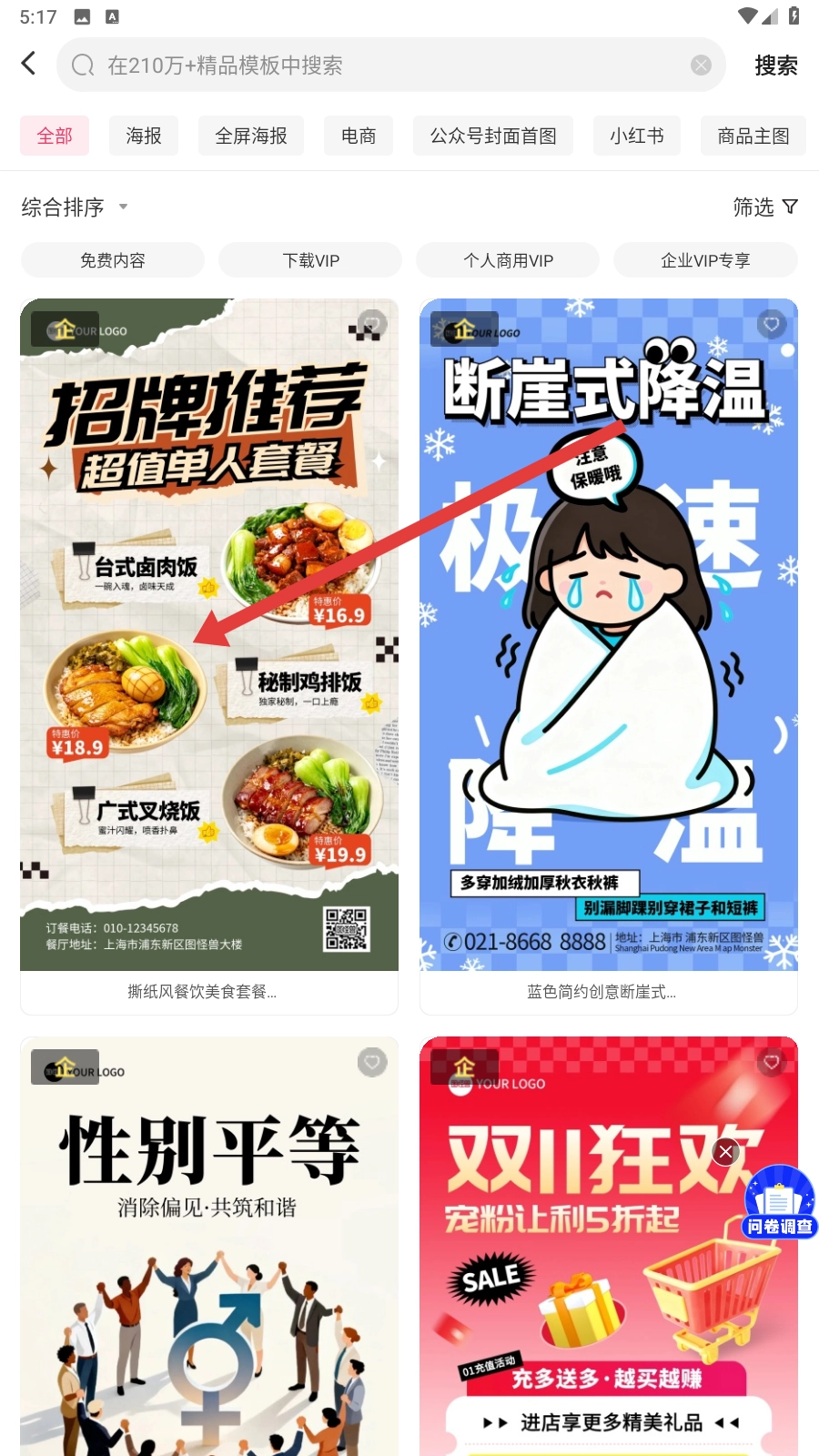 在模板搜索页面,挑选你感兴趣的模板(比如【招牌推荐超值单人套餐-模板】),然后进入该模板的预览页面。