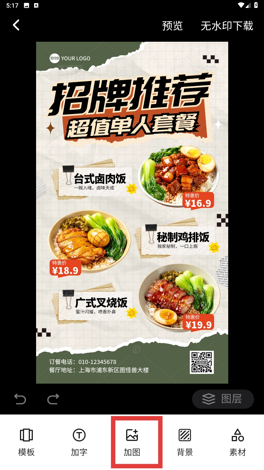 在模板预览页面,点击底部的【加图-功能按钮】,即可进入图片选择界面。