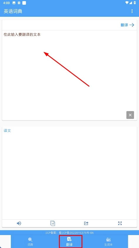 点击底部的【翻译】功能按钮,进入翻译页面后,在输入框中填写需要翻译的文本内容,最后点击翻译按钮即可得到译文。