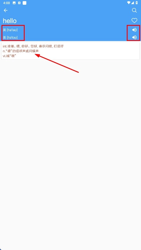 查询之后,你可以查看单词的音标和释义,另外还能点击右侧的喇叭图标来听发音。