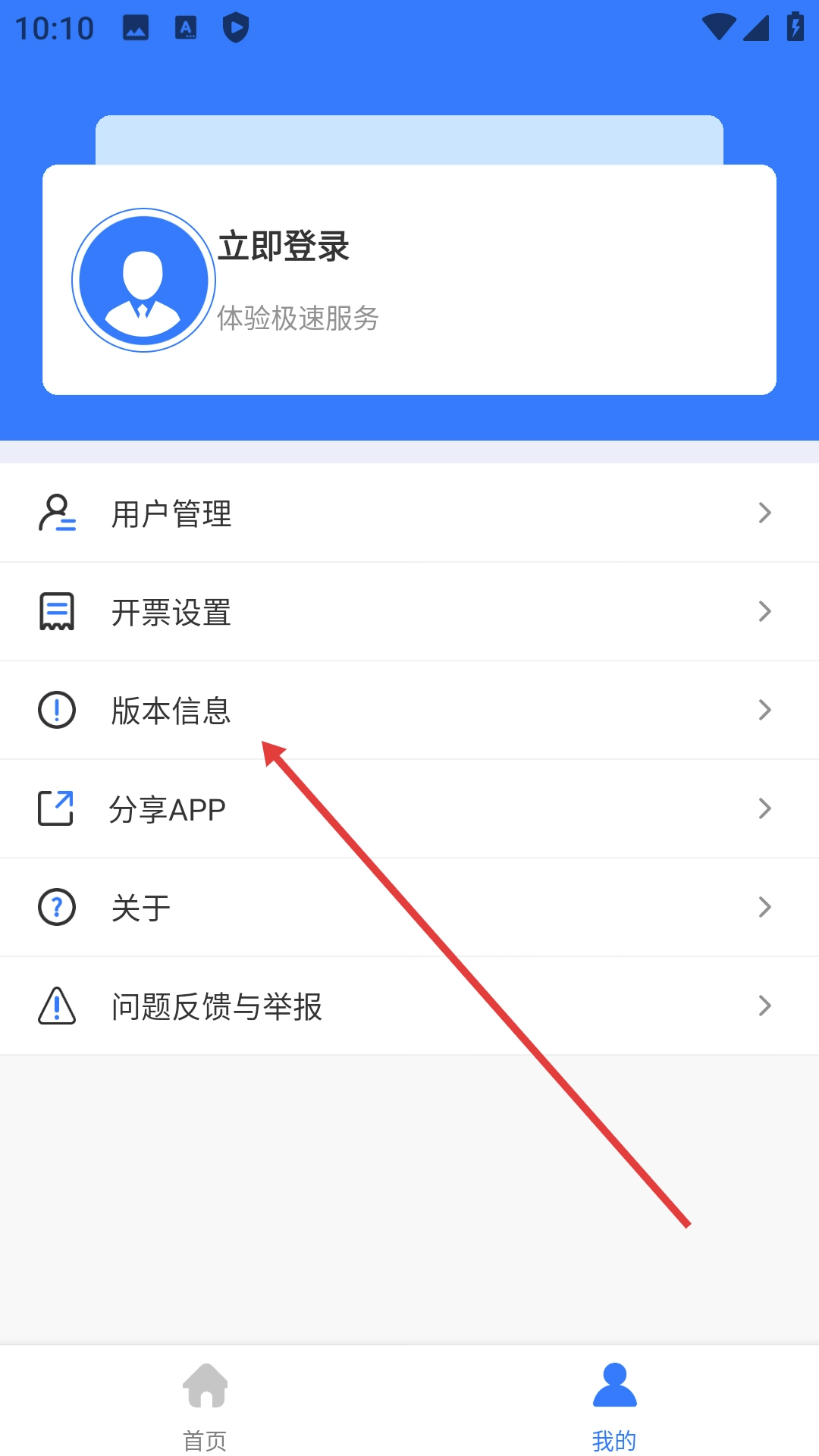 点击页面底部的【我的】按钮,进入个人中心页面后,就能看到用户管理、版本信息等相关功能选项。