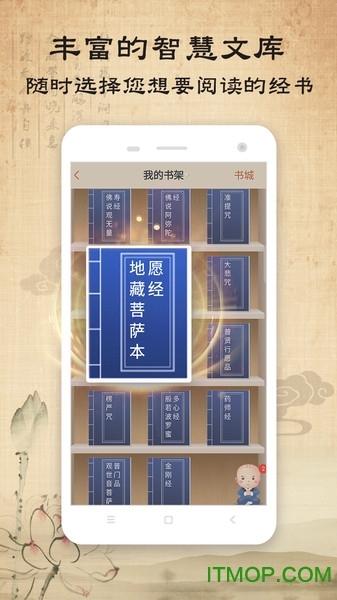 6、智慧文库:在这里,你能随时随地阅读各类经书,如大悲咒、般若波罗蜜多心经、往生咒、观音大士赞、佛说阿弥陀经、金刚经等一系列经忏诵唱图书。沉浸在佛音的熏陶之中,经常诵读佛经、聆听佛教音乐,不仅对人生命运有着积极影响,更是修行者追随佛陀、精进修行的必经之路。