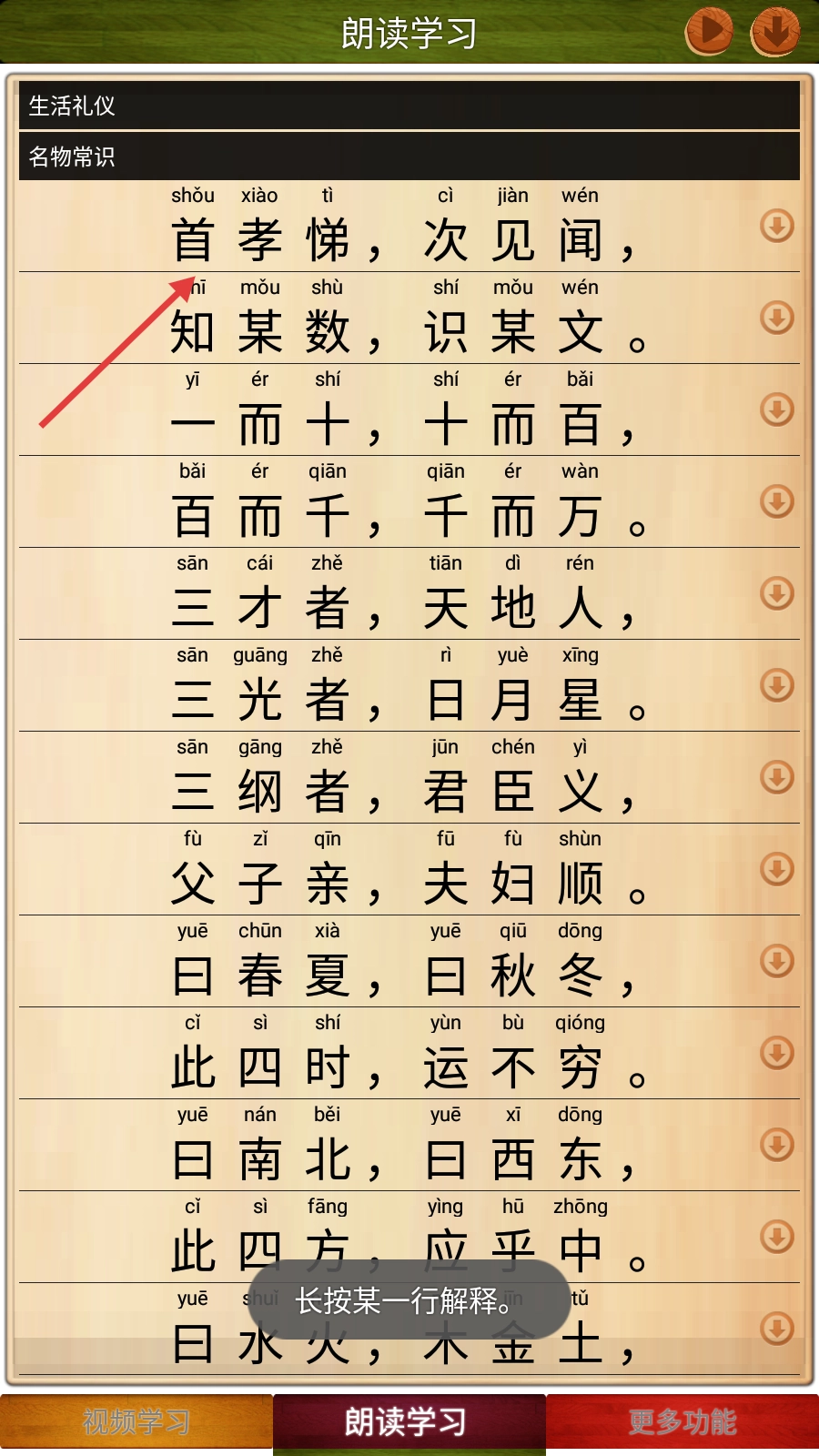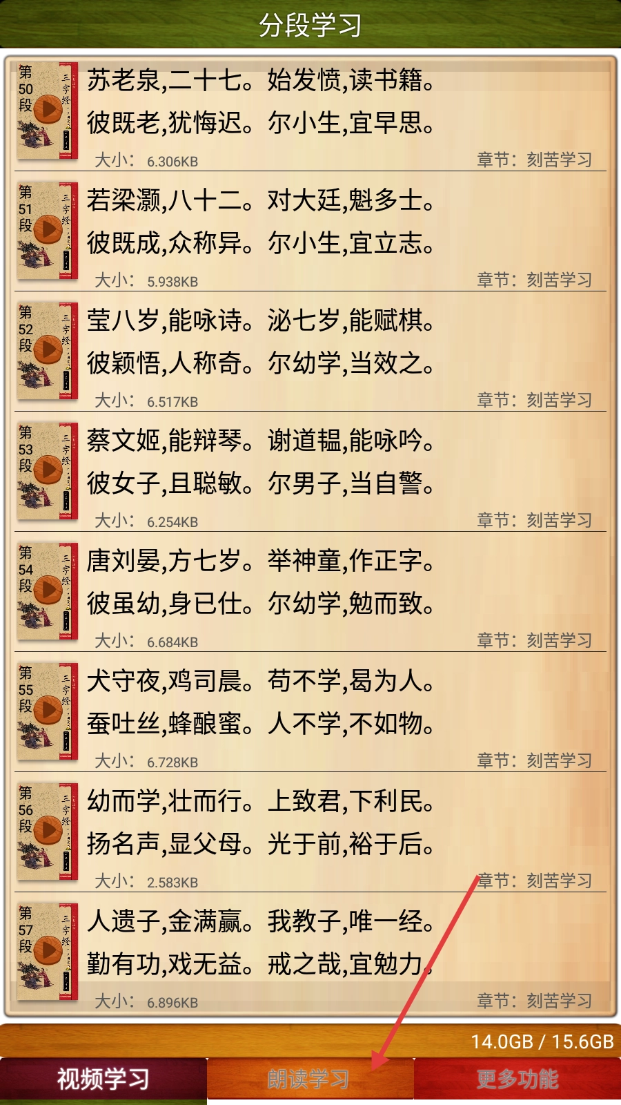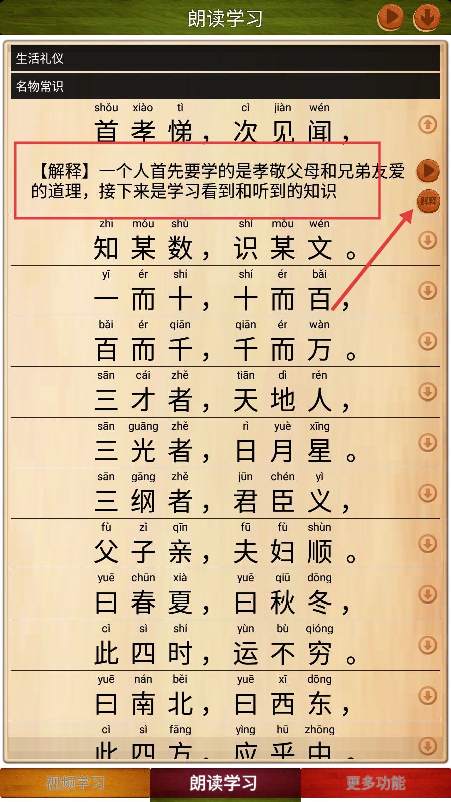 在《三字经》的学习过程里,点击下方的【朗读学习】按钮,就能进入朗读学习页面。