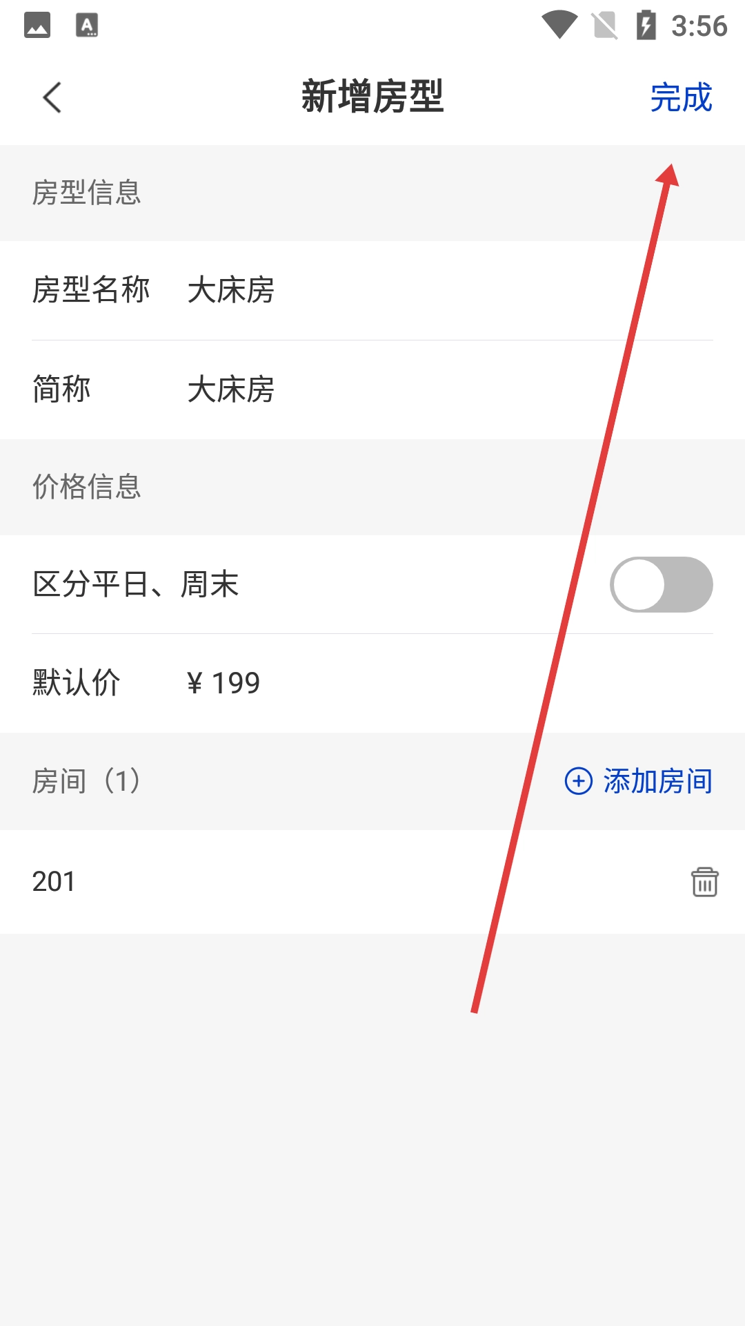 填写【房型名称】【价格】【房间号】等相关信息后,点击【完成】按钮,即可完成房型的添加操作。