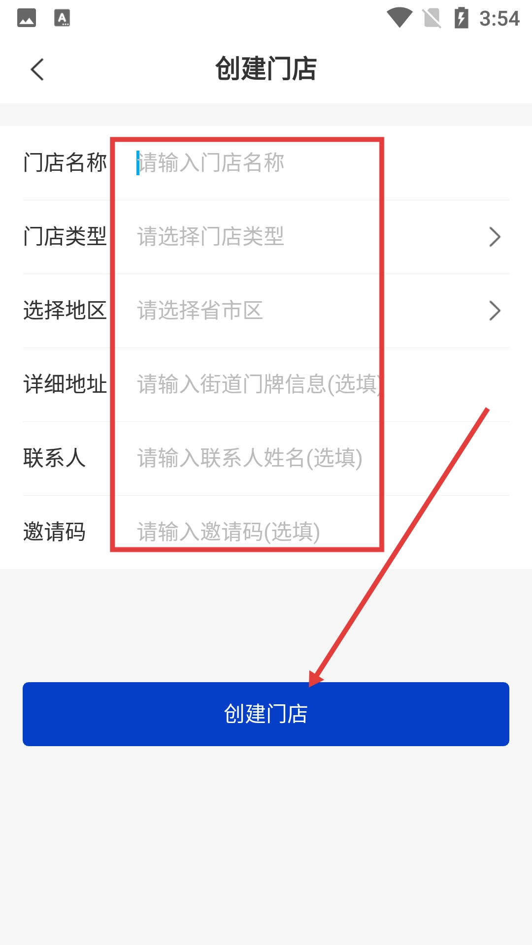 在填写好【门店名称】【门店类型】【选择地区】等相关信息之后,点击【创建门店】按钮即可。