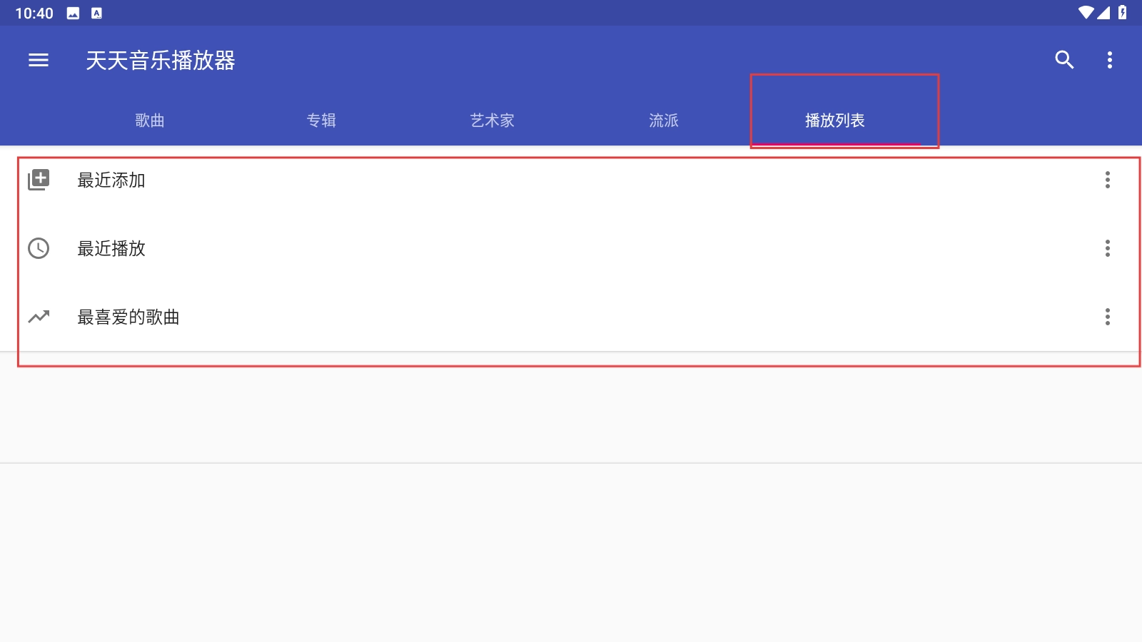 扫描结束后,点击【播放列表-功能标签】,就能查看最近添加、最近播放、最喜爱的歌曲等各类列表。