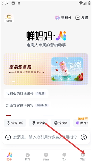在蝉妈妈AI的主界面中,找到底部的【内容】选项并点击,进入内容板块后,就能看到直播、视频等不同的内容分类。