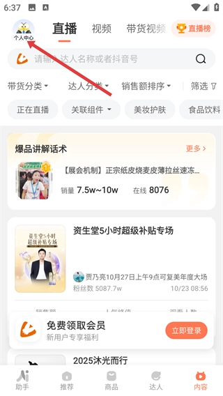 进入内容板块后,点击左上角的【个人中心】按钮,即可进入个人中心界面。