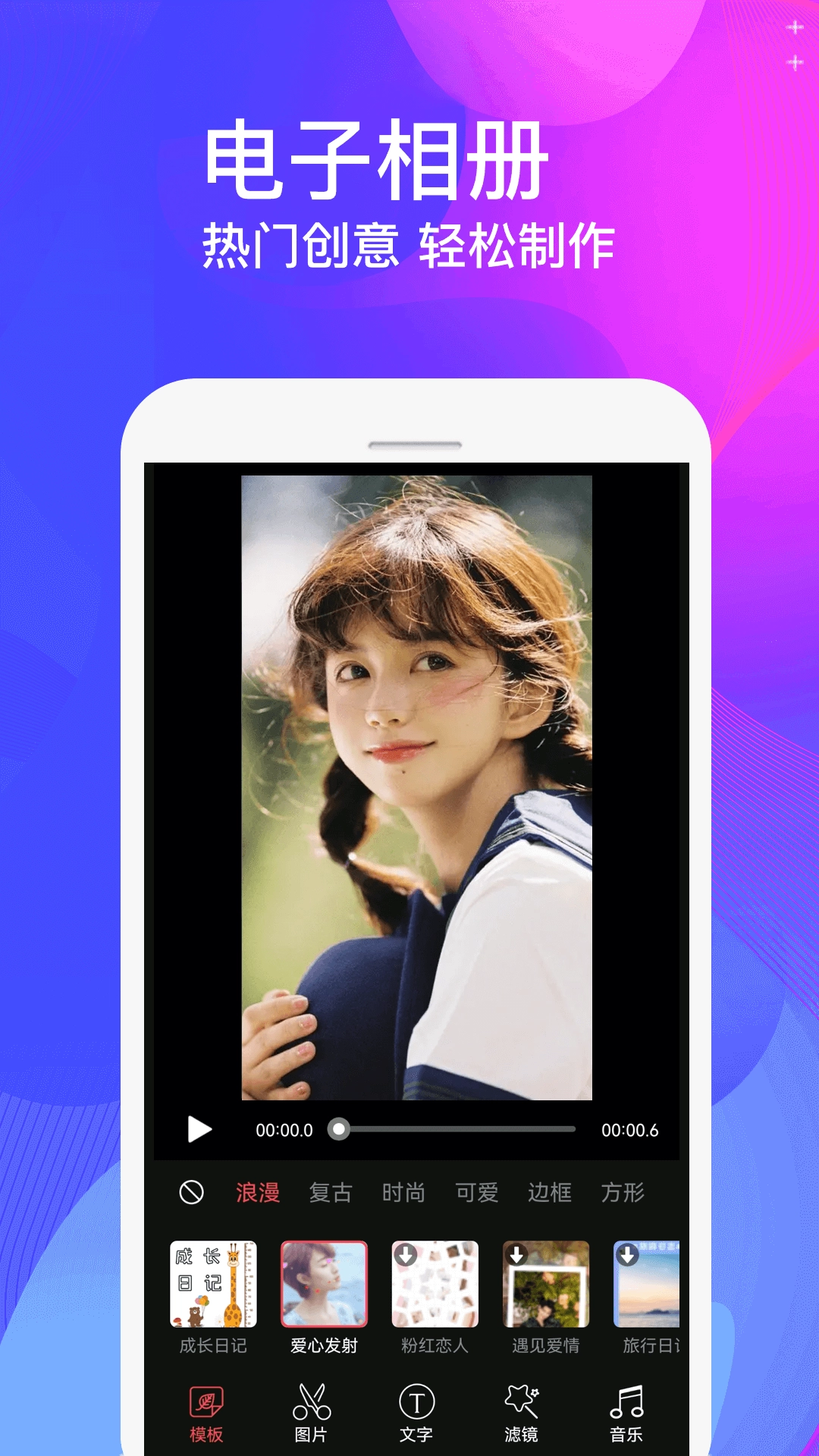制作音乐电子相册,留存生活中的点滴瞬间:支持自定义背景音乐与字幕设置。