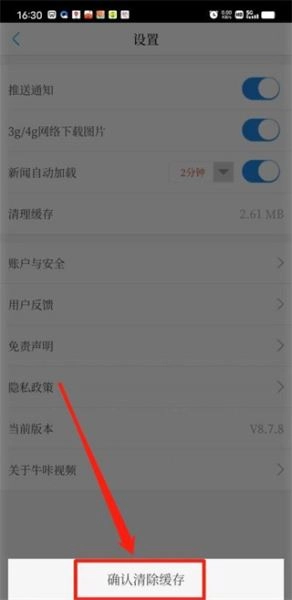 接着进入设置页面,这里有清理缓存、账户与安全、用户反馈等功能选项,我们直接点击【清理缓存】按钮。