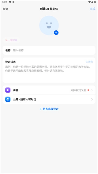 3、接着点击更多高级设定后,能够设定介绍和开场白等设定;