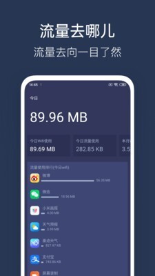 2、流量使用排行:监控手机流量时,能直观了解自己在哪个软件中消耗流量最多。