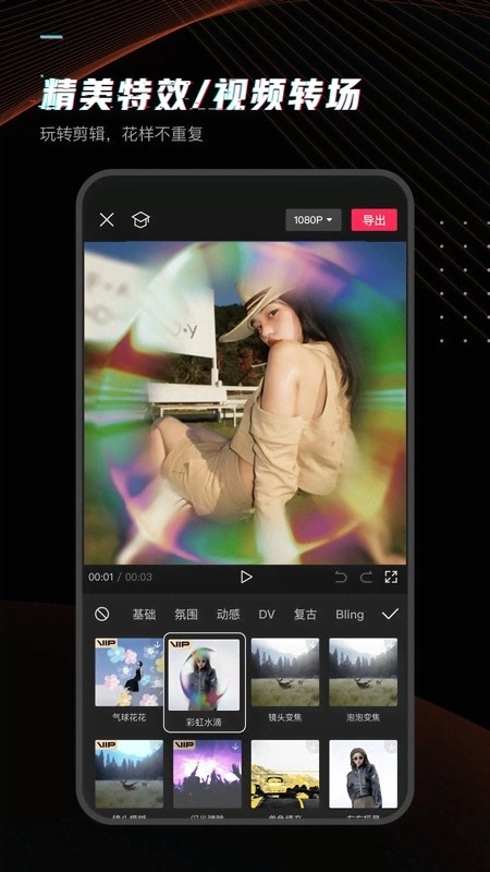 剪映配备专业质感滤镜,一键即可实现自然美颜,轻松让日常画面秒变电影质感大片。
