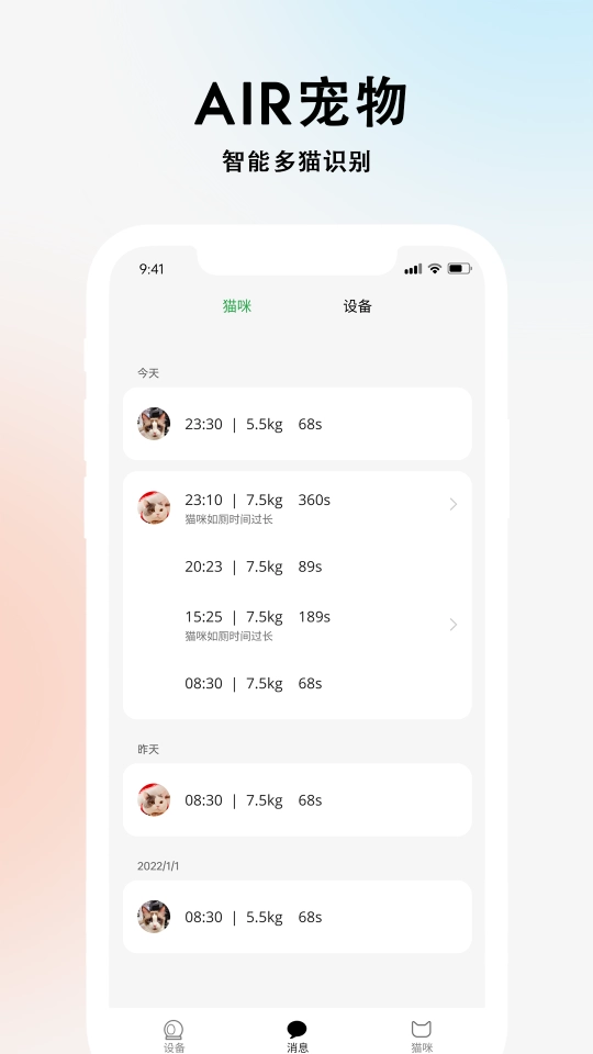 智能多猫识别功能,借助体重差异与AI智能识别技术,能够精准分辨不同猫咪,最多可识别6只,从而让消息推送和数据管理更加准确。