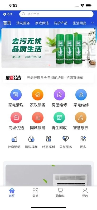 3.在软件的商品分类的功能中,有各类的设备清洗的项目,包括但不限于空调清洗、油烟机清洗、洗衣机清洗、饮水机清洗,以及冰箱清理等等。