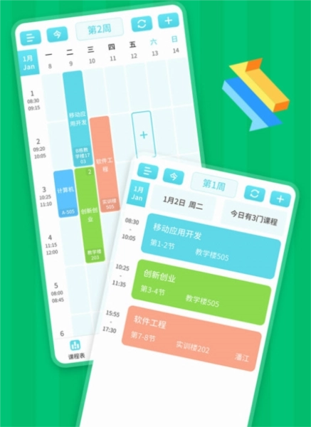界面设计直观易懂,添加新课程时只需点击对应日期就能完成操作,同时还支持大学课节的合并功能以及单双周课程安排的变化设置。