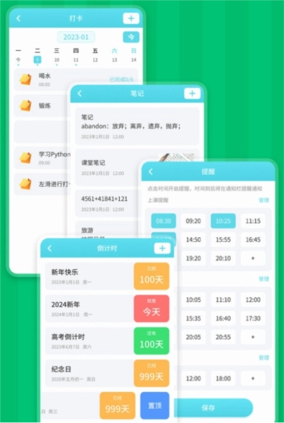 重要日期倒计时:可自定义生日、四六级考试、寒暑假等各类日期的倒计时功能。