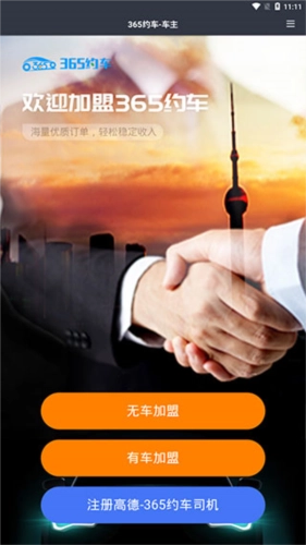 3、跳转后会呈现出下图所示的界面,该界面包含三种选项,分别是无车加盟、有车加盟以及注册高德-365约车司机。