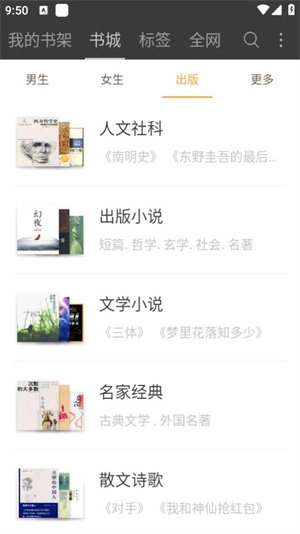 除了小说之外,我们还能接触到人文社科类读物、已出版的各类小说作品、文学性较强的小说以及名家创作的经典书籍等多种类型的读物。