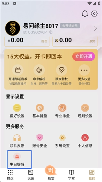 安装易问八字,打开【我的】界面中点击生日提醒。