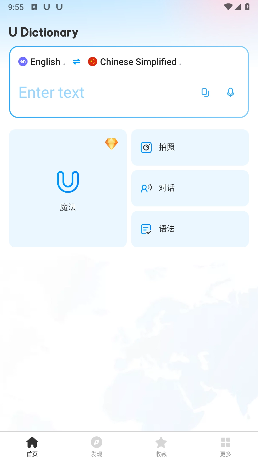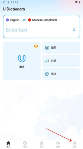 启动U-Dictionary有道词典应用后,映入眼帘的是清爽简约的功能布局,里面包含了魔法翻译、拍照翻译、对话翻译和语法翻译等多种翻译模式可供选择。