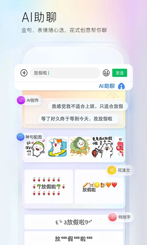 这款输入法工具功能相当全面,不仅支持语音输入、拼音输入、英文输入、笔画输入、五笔输入和手写输入等多种输入方式,用户可以根据自己的习惯选择合适的打字方法;还提供了大量精美的键盘皮肤,让用户能够自由定制,打造个性化的输入界面;此外,它还了丰富的表情包,让用户在聊天时能有更多样化的表达,是一款使用体验很好的输入法软件。