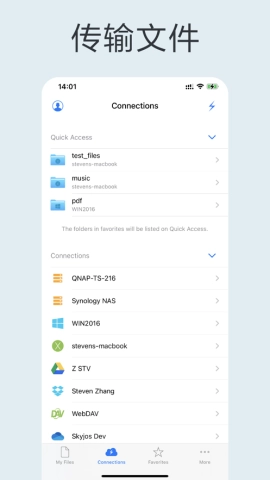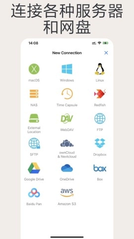 可以直接通过SMB协议连接PC、Mac以及NAS设备上的共享文件夹,并且对NFS、WebDAV、FTP和SFTP等服务提供完善支持。同时,它还能无缝对接百度网盘、Amazon S3、Dropbox、OneDrive、Google Drive和Box等各类云存储服务,方便您随时访问USB驱动器与SD卡。