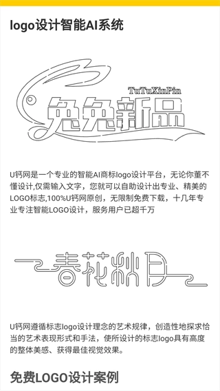 u钙网是一款专注于logo设计的服务工具软件,强大的AI智能设计系统。用户只需输入自身的想法与创意,通过简便操作,软件便能依据用户需求自动生成logo图标。所有设计的图标均为原创,且可完全免费使用,有需求的用户不妨体验一番。