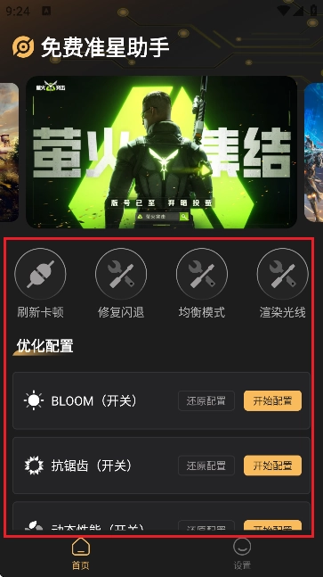 进入软件首页后,界面如图所示。这里包含了刷新卡顿、修复闪退、均衡模式、渲染光线、优化配置等多种功能选项。