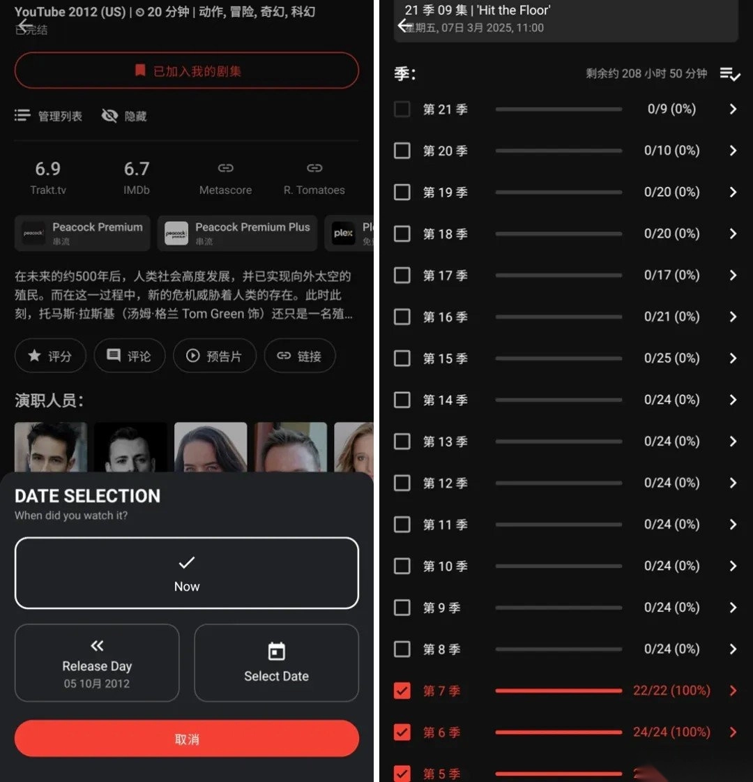 记录的粒度变得更精细,能够具体到单集内容。在标记观看状态时,还可以从即时标记、自定义日期或剧集最初播出时间这三个选项中选择,相比国内同类平台仅支持记录当日观看的模式,这种设置显然更具灵活性。