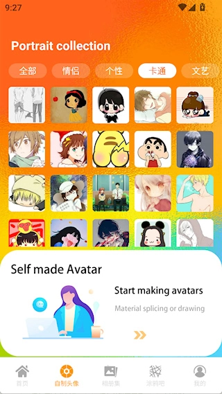 在【自制头像】界面中,提供了卡通、文艺等不同风格的头像类型,用户也可以上传本地图片来制作专属头像。
