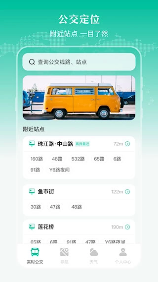 基于地理定位呈现周边公交站点及线路的分布情况,还能叠加实时路况信息,便于用户步行导航前往车站。