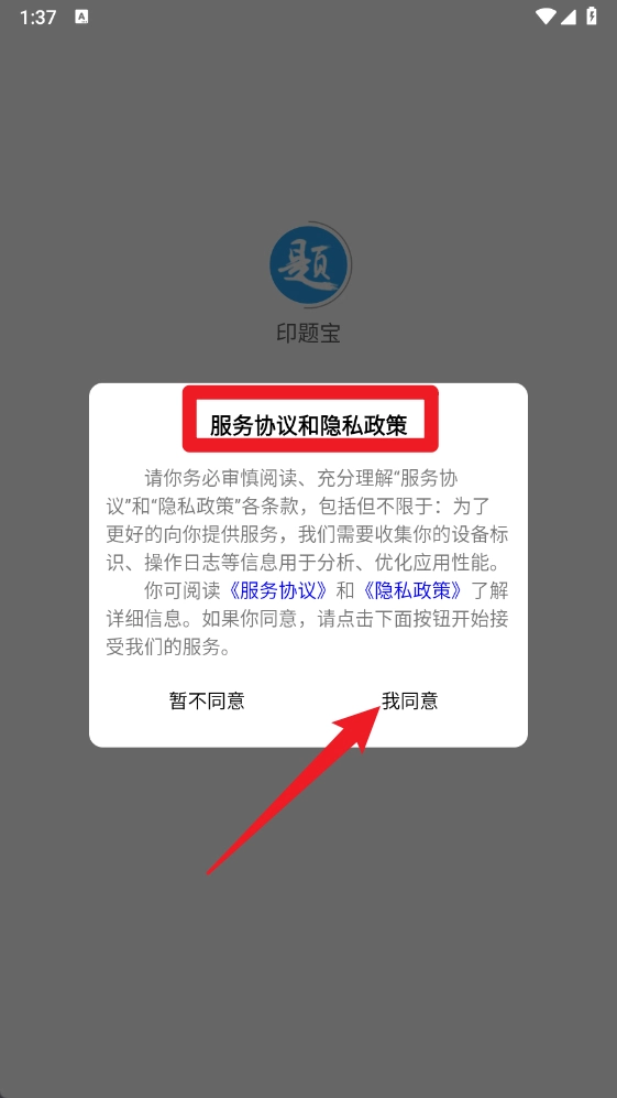 首次使用印题宝时,系统会弹出《服务协议和隐私政策》,用户需点击“我同意”按钮方可继续使用该应用。