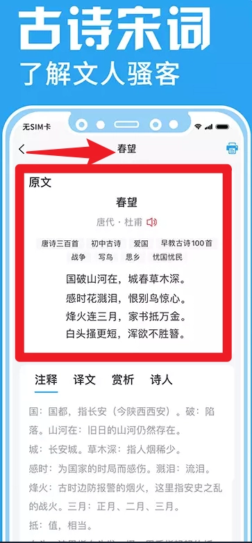 在古诗宋词板块,用户能够查阅原文、注释、译文与赏析,进而深入领会诗文内涵,提高自身的文学修养。