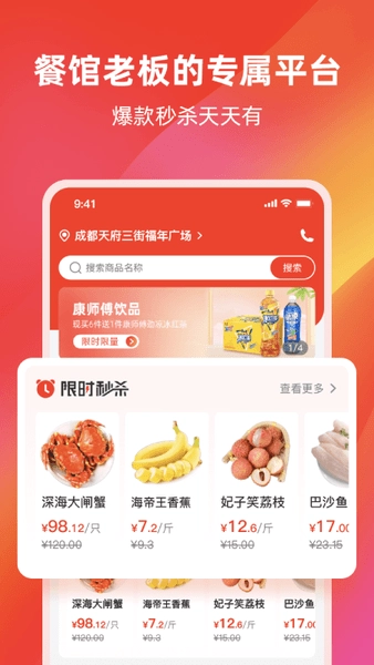 3、一站式采购,省心省力:餐饮经营所需的各类物资,从基础调料到酒水饮品,再到专业厨房设备,都能在这里一次性备齐,轻松满足所有需求。