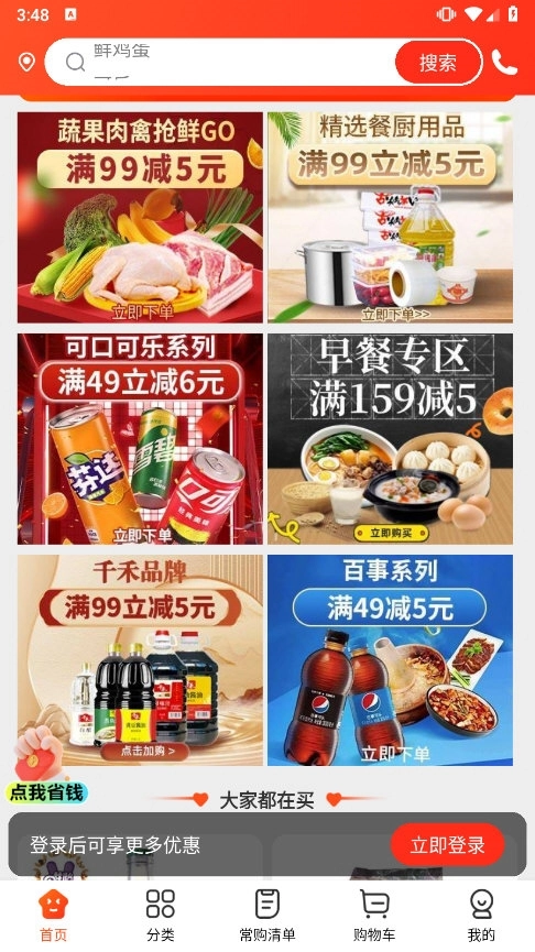 用户能够在首页查看优惠专区里的商品列表,借助搜索功能迅速定位到想要的商品。