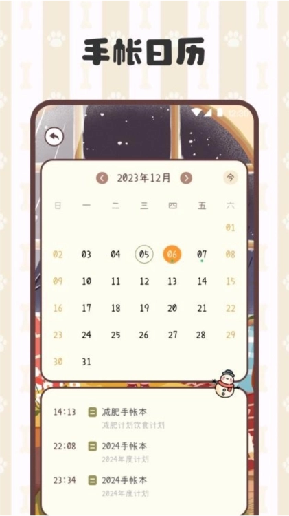 3、日历状态查看记录:日历功能使用户可以根据日期快速浏览手帐记录,方便回顾过去的美好时光。用户可以随时编辑和添加新的记录,让手帐与日历状态无缝连接。