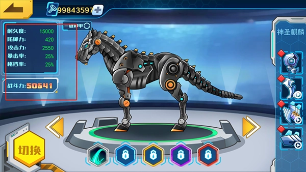 在机甲仓库里,你能够解锁各式各样的机甲,左边会展示机甲的耐久度、防御力、攻击力之类的属性。