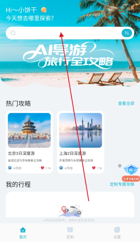 打开AI导游路线软件的【首页】后,在页面上方的搜索栏里输入你感兴趣的景点名称,就能迅速获取该景区的相关信息了。