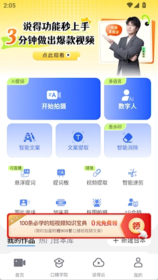 首页提供“数字人”、“悬浮提词”等功能的快捷入口