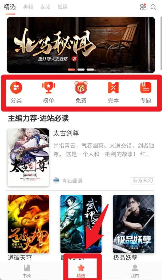 切换至精选栏目,便能浏览分类、榜单、免费、完本以及专题等各类阅读资源。