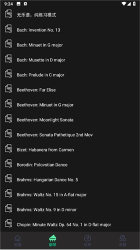2、进入钢琴页面,里面支持丰富的乐谱练习。