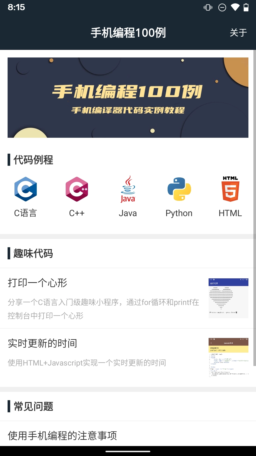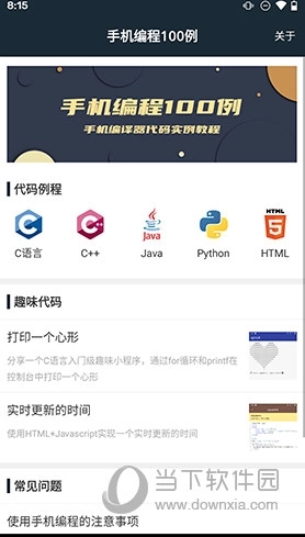 《手机编程100例》最新版本汇集了海量实用编程案例,覆盖C语言、Java、Python等多种主流编程语言,用户可根据自身兴趣选择对应类别浏览示例;同时还提供常见问题解析与解决方案,助力编程能力提升。本教程内含丰富示例代码,兼容C、C++、Java、Python、HTML等主流语言,有效降低编程初学者的入门门槛,缓解学习曲线陡峭的痛点。