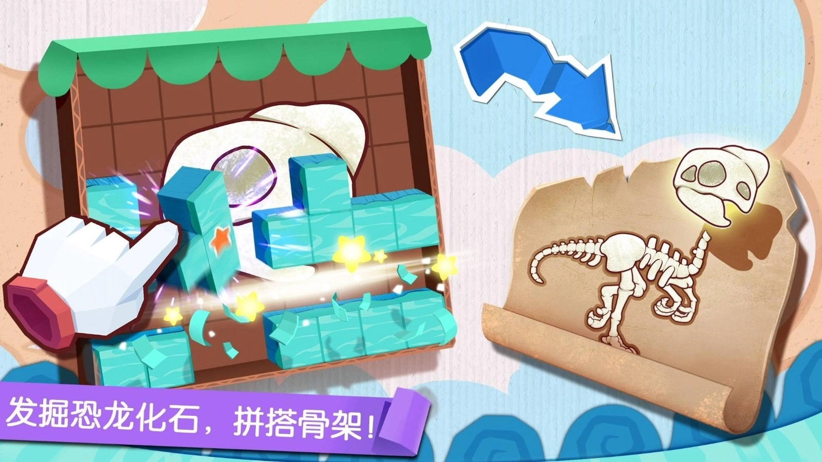 方块消除后露出完整的化石拼图即可过关。
