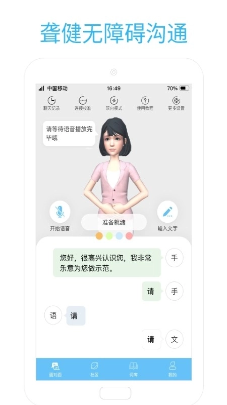 易手语是一款专注于无障碍沟通的手语软件,它巧妙融合了词典功能与在线学习模块,旨在为用户提供更优质、更全面的服务体验。平台上丰富多样的在线教学活动,能让用户及时获取手语学习各领域的前沿知识。作为与呜啦啦手语翻译手套配套使用的Android移动应用,两者协同工作时,听障用户可轻松实现与普通人的双向顺畅沟通,进而在教育、交友、婚恋、就业、医疗、安全保障及生活质量等多个维度获得全面提升。这款软件不仅能助力人们之间便捷高效地交流,还能切实改善有需求用户在就业、医疗、交友、教育等生活各方面的状况,而且操作起来十分简便。