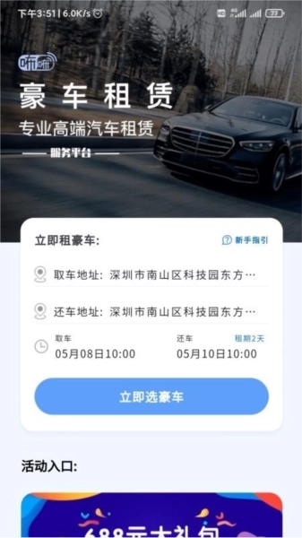 【福利活动】新用户完成注册登录,即可领取价值688元的租车大礼包;畅享高性价比租车服务,轻松开启豪车驾驶体验!