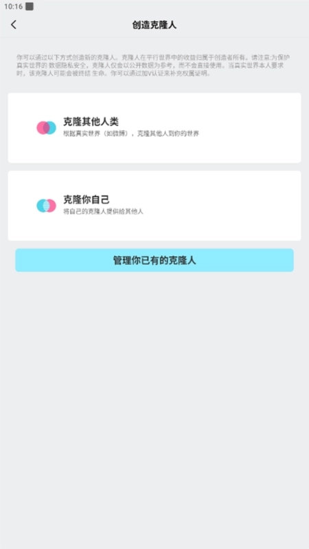 2、在“发现”页面,能够参与克隆人计划,创建智能。