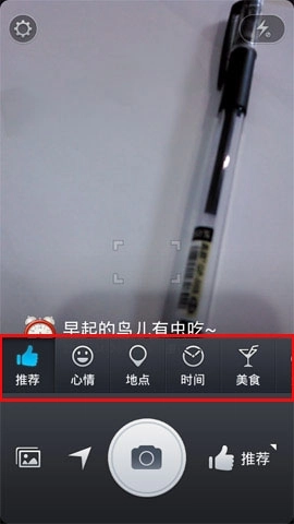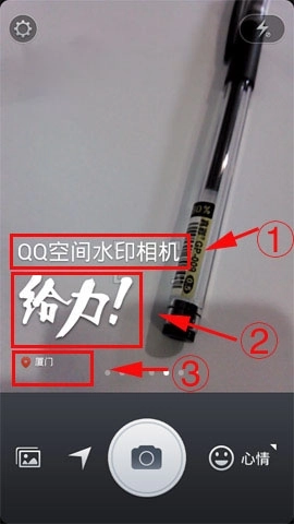 2、界面和手机系统自带的相机差不多,主要多了水印功能。用户可以左右滑动手机屏幕来挑选水印,腾讯水印相机提供了心情、地点、时间、美食、天气五大类水印供选择。