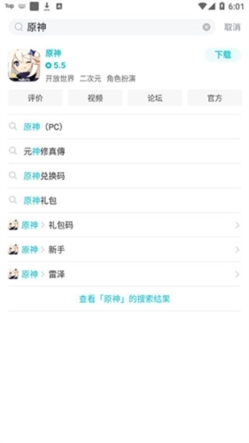 2、接着点击首页右上方的搜索图标,输入游戏名称(例如原神),这样就能看到该游戏的相关信息了。